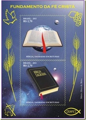 The Brazilian Post has issued a block of commemorative stamps for Christmas 2011 featuring Holy Bilble'. The upper stamp has the image of an open Bible with the Planet Earth as background. At the lower stamp the closed Bible on a beam of light represents the word of God.